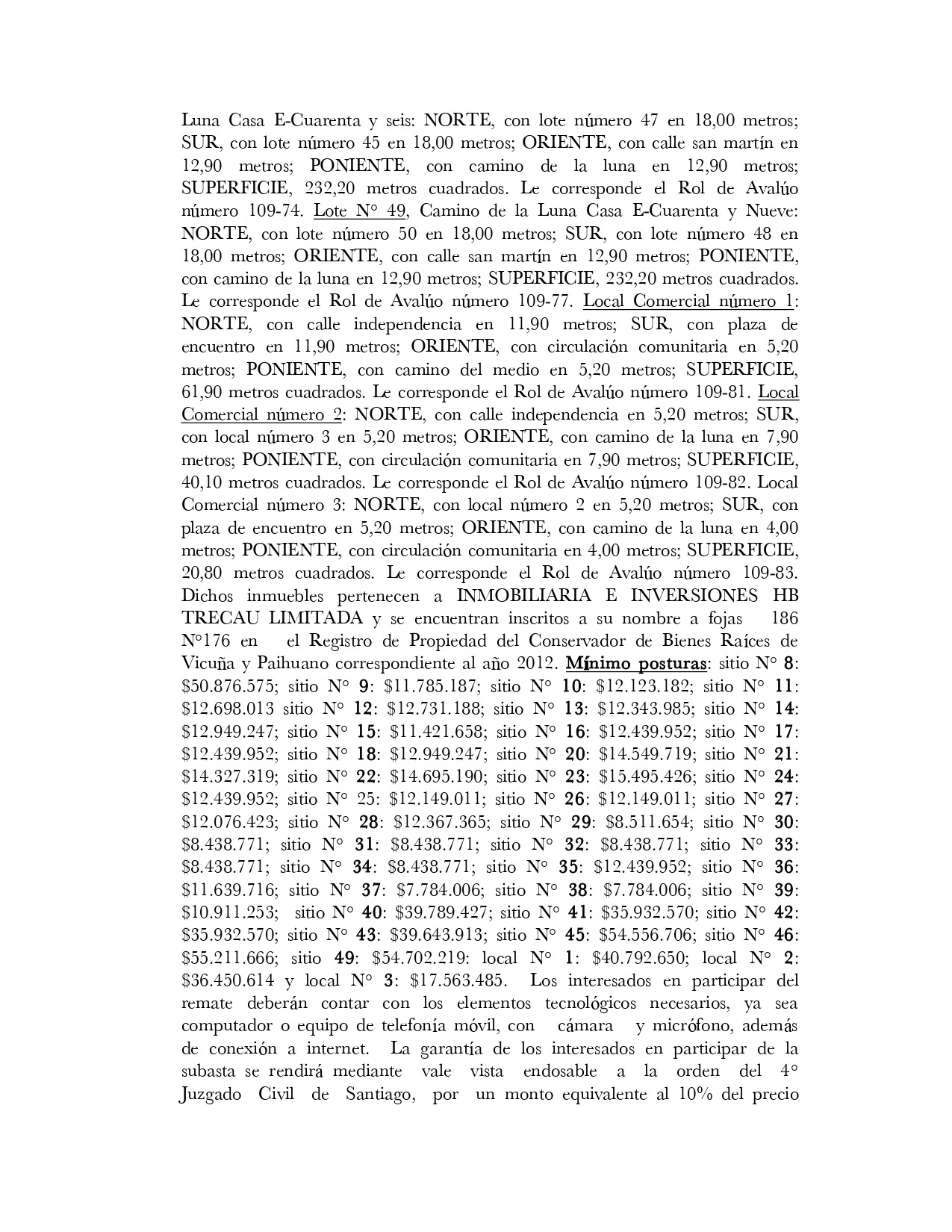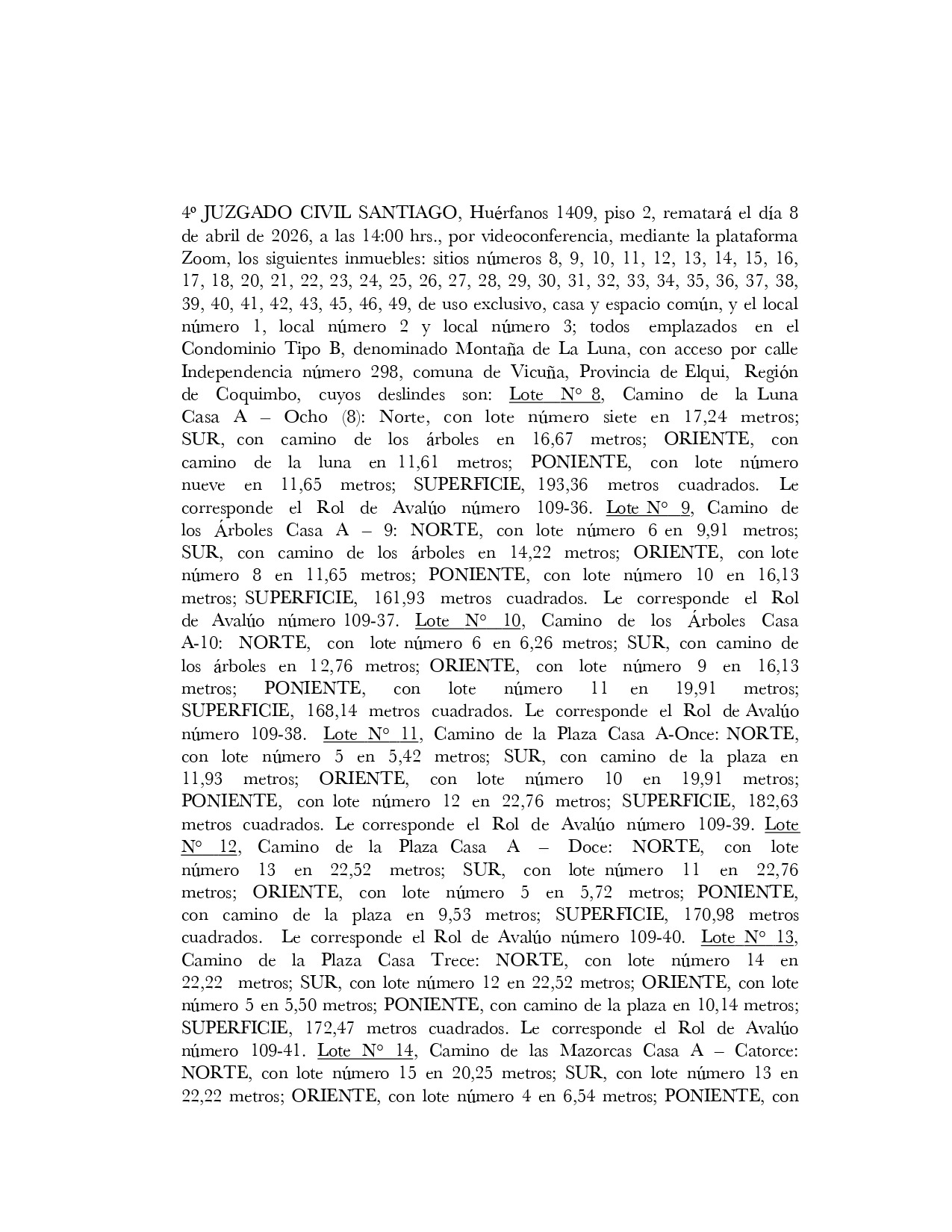 Remate. Inmuebles emplazados en Condominio Montaña de La Luna, con acceso por calle Independencia 298, comuna de Vicuña